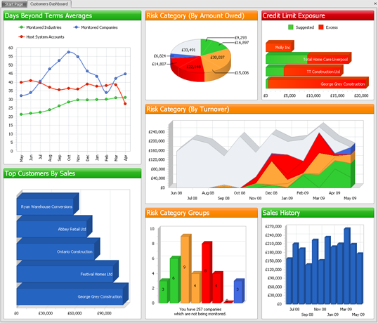 The Customer Dashboard displays a blend of information about the customers from your accounts system. Some of the charts are built-up of information taken purely from the accounts system, some are are built-up purely from the Experian data, while others are a blend of both the accounts and Experian information.