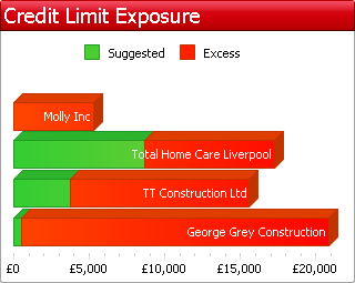 This displays up to 4 customers that owe you the most money beyond their recommended credit limit. The balance of the recommended credit limit from Experian is shown in green and any balance over the credit limit is shown in red.