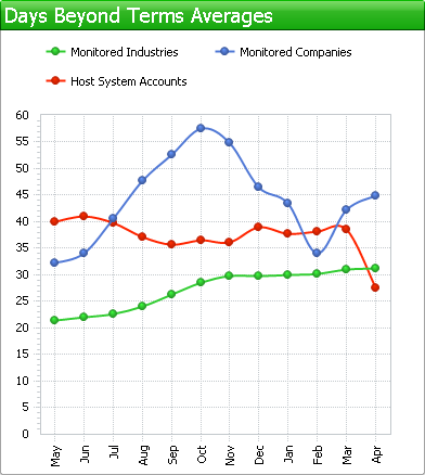 The chart shows you a monthly average over the last 12 months of how promptly the companies you are monitoring pay their bills and how promptly the customers from your accounts pay you. Up to three different series of data will be shown, depending if you have linked Credit Guardian to your accounts system and are monitoring companies.