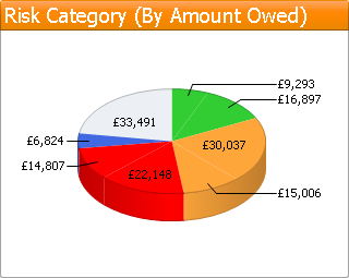 ![]() This pie chart merges how much you are currently owed by the companies in your accounts system with their risk category taken from Experian. This gives you a breakdown of how much money you are owed by high risk, average risk and low risk companies. It also, importantly, shows you how much money is owed to you by companies that you are not currently monitoring. Using this chart can help you decided if its more important to chase money owed to you by high risk companies rather than low risk. | |