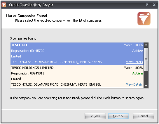 - If more than one company is found, the next page that appears will contain a list of search results. Each entry contains details on the company such as its name, registration code, registered address, its matched percentage and whether it is active or dissolved. If a company is marked as dissolved it means the company is no longer trading. Click on View Details on each result to see more information on the company. If the company you are looking for isn't listed then click the Back button and edit your search criteria.