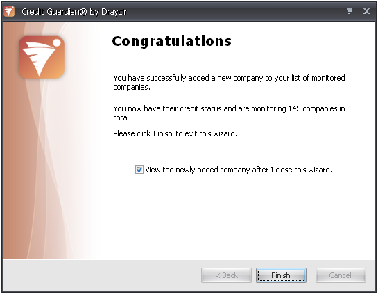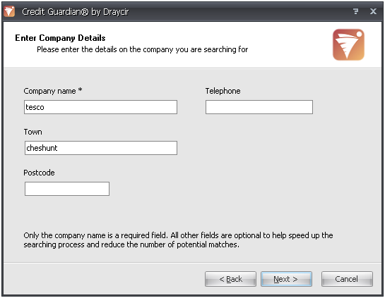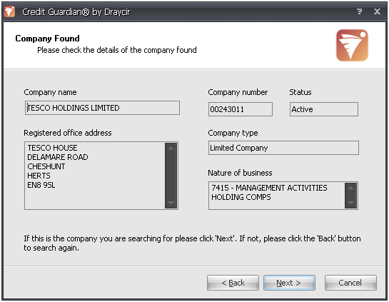 - Information on the company will be downloaded from the Draycir Credit Guardian server and saved to your local Credit Guardian database. When the download has completed it will automatically move on to the next screen.