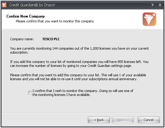 - You now need to confirm that you want to monitor this company. Monitoring a company will use one of your subscription licences. You will not be able to reuse the licence until your subscription expires and you renew it. Tick the box confirming that you want to monitor the company. The Next button will now be enabled. Click Next to begin monitoring the company.