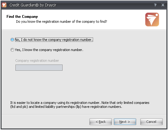 - Every limited company (LTD, PLC, LLP etc) is assigned a unique company registration number by Companies House and using this number is the easiest way for Credit Guardian to find the company. Lots of companies place their company registration number on their website or letterheads. If you have this number select 'Yes, I know the company registration number' and type the number in the edit box labelled 'Company registration number'. Click Next to continue and go to step 9.