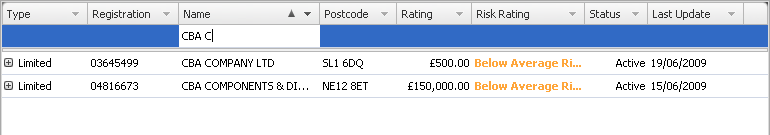 You can apply filters to the list by clicking in the blank area just below the name of the column and begin typing. In the example above we have filtered by Name where we want to display all companies beginning with 'CBA C'.